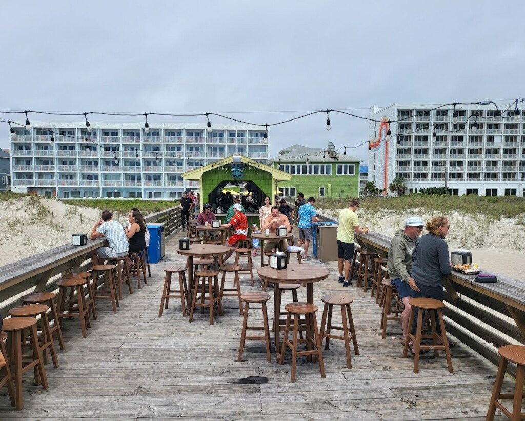 The upstairs dining room provides panoramic views of the Atlantic Ocean, allowing guests to enjoy their meals while taking in the scenic shoreline. For those seeking a more relaxed setting, the downstairs area features a bar and patio dining. Just steps away, the Tiki Bar stands on the remnants of the Center Pier, which was destroyed by Hurricane Fran in 1996. This pier-based bar offers a laid-back spot for both locals and visitors to savor tropical cocktails or cold beers after a day at the beach.