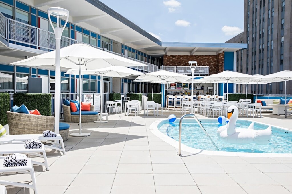 Unscripted Durham is a boutique hotel located in downtown Durham, North Carolina, offering 74 rooms and suites that feature vibrant mid-century design.